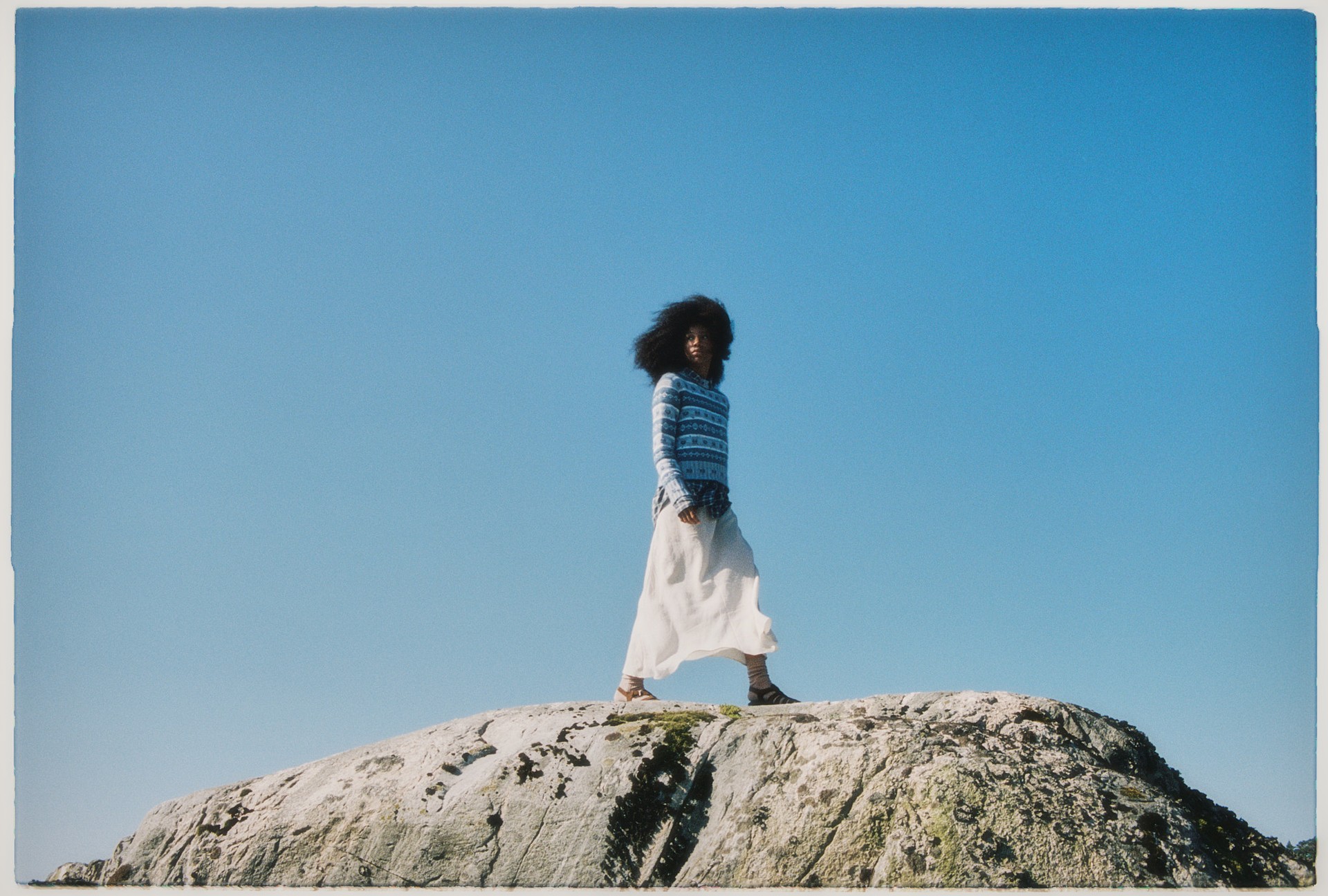Tying the boat to the rocks on one of the islands dotting the horizon. Soft knits easing the light ache from cool, blue waters. Stolen looks and safe havens, in a timeless Nordic dream-state.